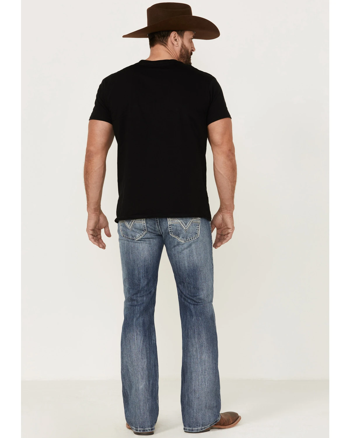 - Heavy “V” stitching on back pockets
